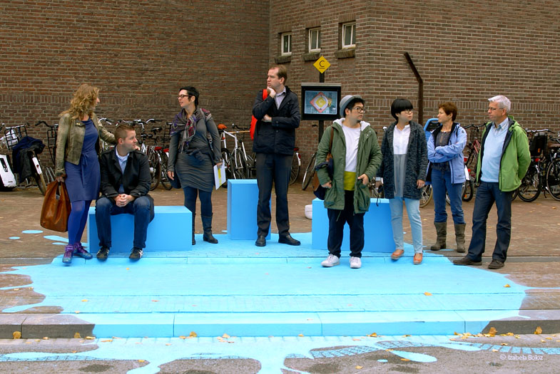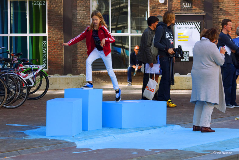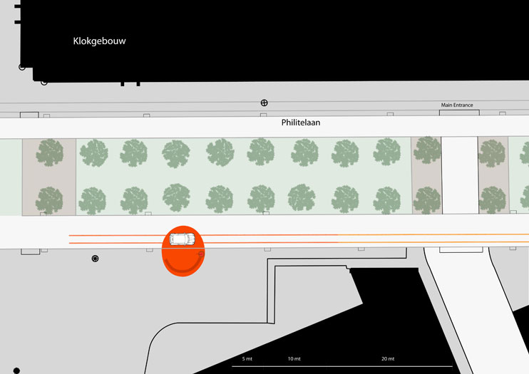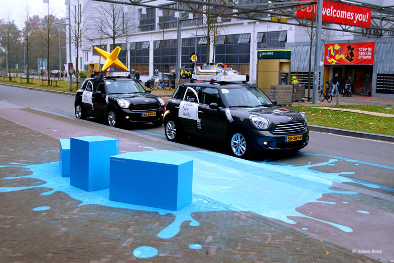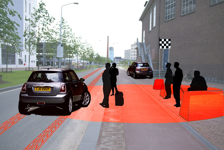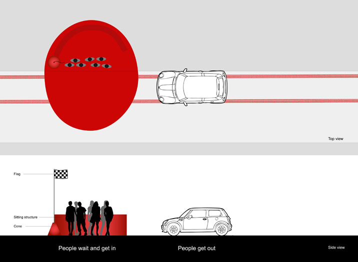 The MINI design rides Waiting Spot is a public space installation meant to create a visible spot for both the taxis transporting people in between exhibitions in the Dutch Design Week and the users to recognize the spot where they should wait. It was created in collaboration with MINI, using their logo image to create the tracks that draw the path of the cars.